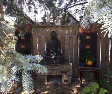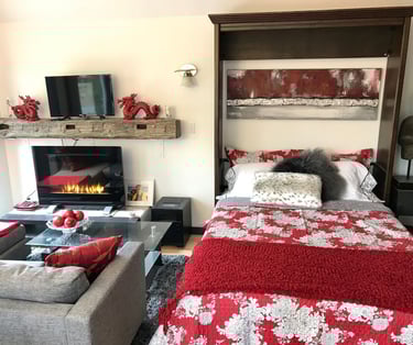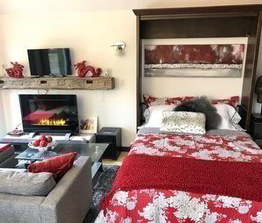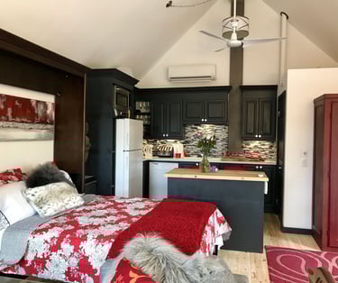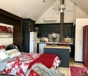 To honour owner Shari MAC's indigenous lineage, the retreat is built from over 80% reclaimed, reused, refurbished and recycled materials. It is rustic/modern. This 700 sq. ft. studio has large bay windows and sits above the Zen garden with trees and flowers, birds and squirrels, water fountain and Buddha. Inside the retreat with wifi, listen to music while preparing a gourmet feast in the fully supplied kitchen. Sip wine under the crystal chandelier or curl up and watch unlimited movies on Netflix. This is a retreat for couples, solo adventurers, and business travellers.