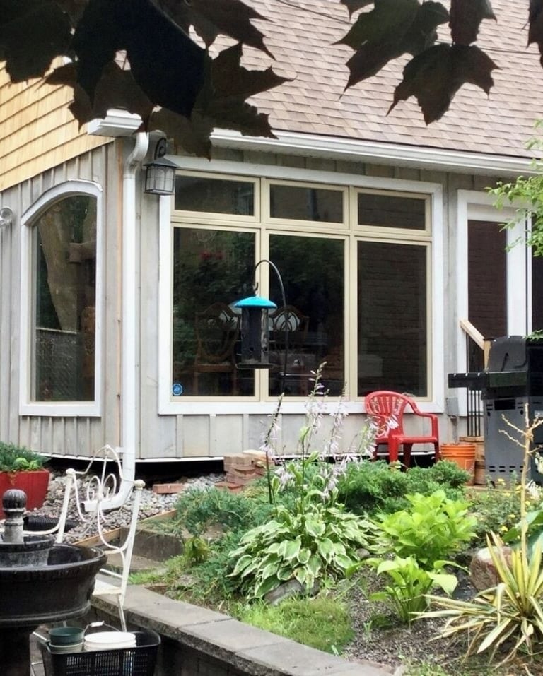 Oversized windows brightening the space and over looking the zen garden